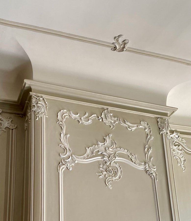 Il est fréquent que l’on fasse appel à l’atelier pour la restauration de décors de faux bois, de faux marbre, ou de retouche sur des décors en trompe l’œil… suite à des dégâts des eaux, l’usure du temps et le vieillissement des patines. Laurent Bouchardon reprend alors souvent l’entièreté de la pièce (murs, plafonds, boiseries) : une intervention délicate qui nécessite de l’expérience tant au niveau des couleurs que de la copie. Il faut en effet restituer les tons, l’aspect du décor et le cas échéant imiter la main du peintre pour que les retouches, reprises partielles ou en totalité, s’intègrent harmonieusement.